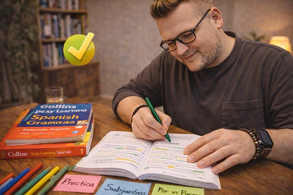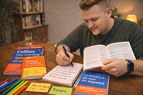 Отличный выбор для тех, кто хочет чётко разобраться в временах (Pretérito Perfecto, Indefinido), местоимениях и базовом Subjuntivo.