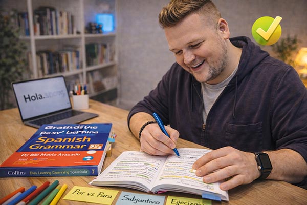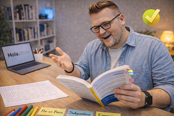 [PROMT: я изучаю испанский на среднем уровне, делаю заметки в учебнике, уверенная атмосфера прогресса, мультяшный стиль]